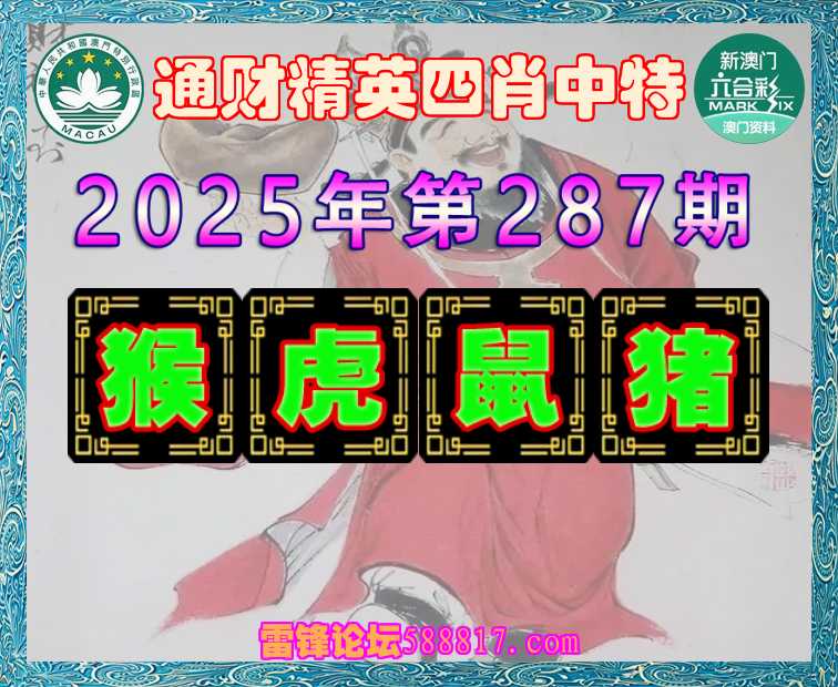 287期: 🍔『通财精英』 🍔四肖中特🍔【猴.虎.鼠.猪】开:00准